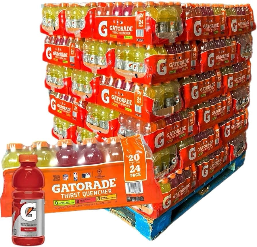 Full Pallet Gatorade Variety Pack 20 oz/24 bottles per case (54 cases/pallet) 1,296 total bottles & Full Pallet Members Mark 16.9 oz/40 per case (48 cases) 1,920 total bottles *3,216 total drinks*